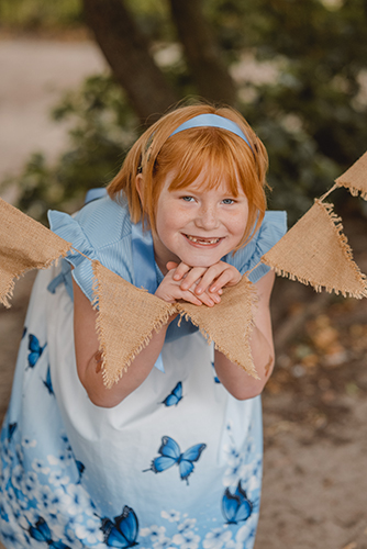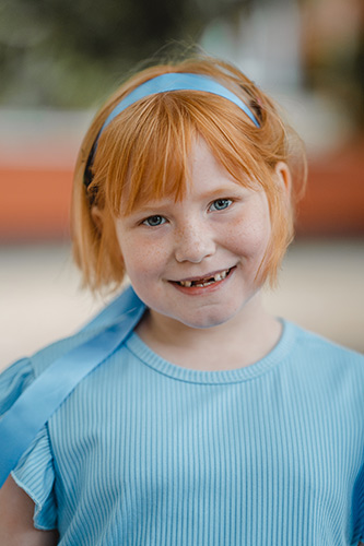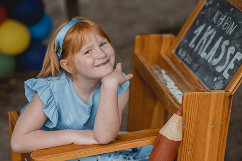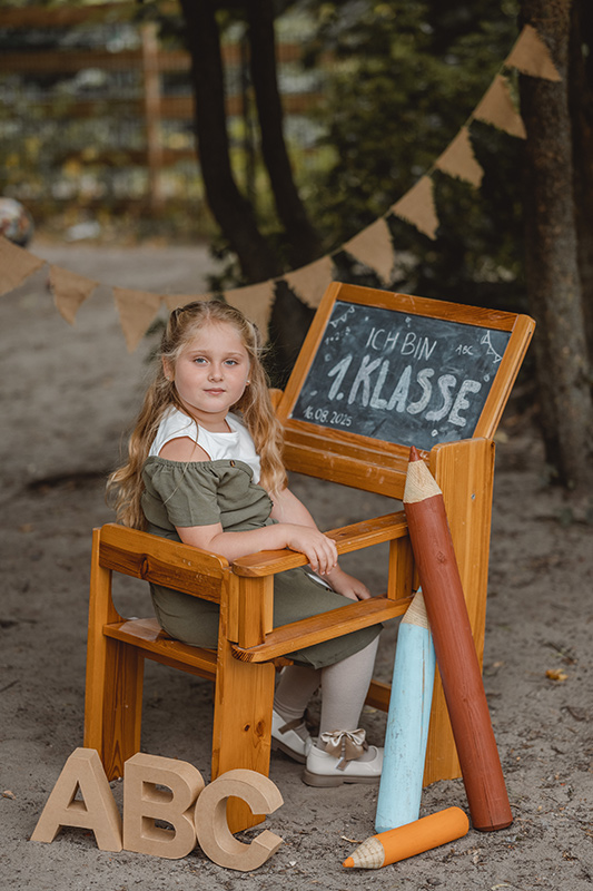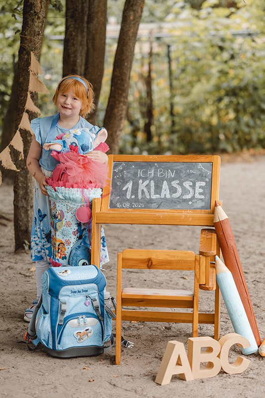 Wir fotografieren die Kinder in der Schule am liebsten im Outdoor-Bereich. Hier suchen wir schöne Plätze aus und überlegen uns einen kleinen Parcour, den wir mit jedem Kind durchlaufe. Auch wenn das Außengelände vielleicht nicht ganz so schön ist, können wir mit einigen migebrachten Accessores wie z. B. eine Tafel, Wimpelkette usw. ganz natürliche Fotos auf ganz spielerische Art und Weise zaubern.